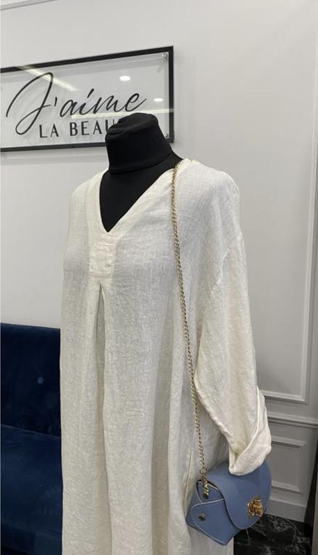 Лляна сукня молочного кольору. Довга. По боках кишені. На рукавах ґудзики. Стильне