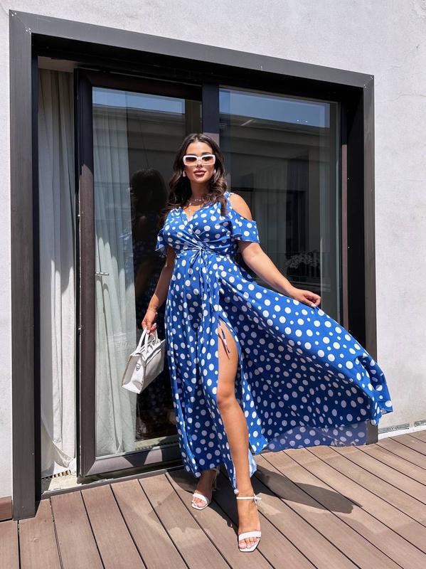 Сукня на запах Мод: 723-247/1 Тканина: софт принт горох Цвет: белый, зеленый, синий, черный Размер: 50-54, 56-62, 62-66 50-54 - от 100-120 56-60 - от 120-135 62-64- от 135 - 155 Длина от плеча 150 см Длина по спинке 130 см Платье с возможностью моделирования,зачет резинки подходит на разный объем бицепса