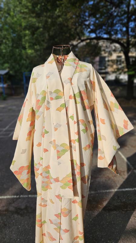 Винтажное японское кимоно. из натурального шелка., возможно 70х роков изготовления. Тесктура креповая, трафаретная печят традицийное реснички, или волна благополучия. э пятна. длина изделия по спинке 152. длина рукава 57 ширина плеча 53