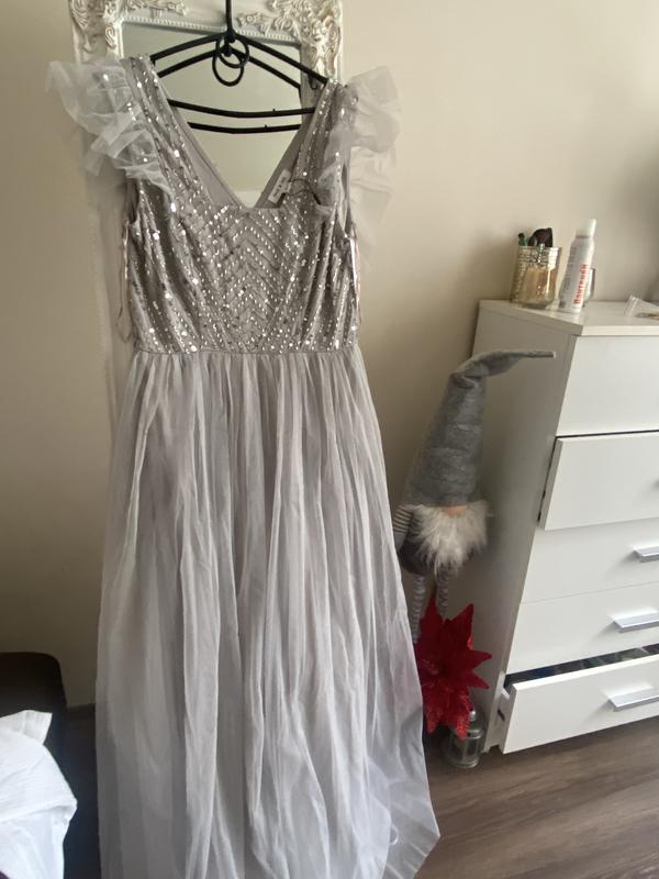 Платье праздничное, новое., размер 10, юбка истины с чехлом, верх бисер и стеклярус, очень красивый серый цвет. Пог 46, пот 37, длина юбки от талии - 110см.