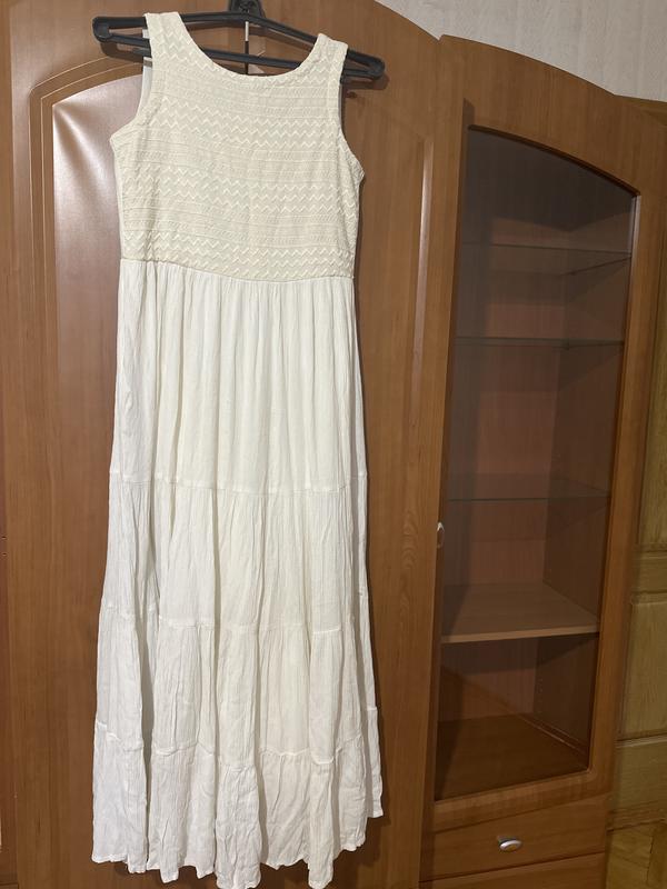 Має молочний відтінок, Легка літня сукня, має підкладку, не була у вжитку. Ширина плечей 31,5 см Напівширина грудей 41 см Довжина 128 см Вказано розмір XS, але це більше S/M