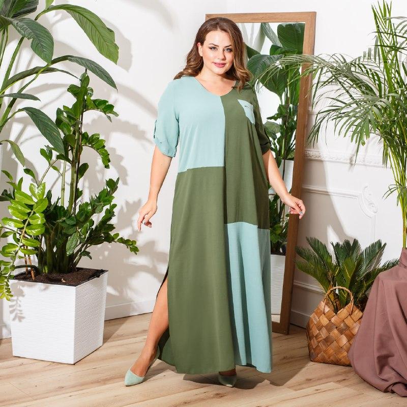 Комбинированное платье из легкой непрозачной жатки в стиле бохо с накладным карманом, по бокам внизу разрезы Ткань: жатка Размер: 48-50, 52-54, 56-58 Цвет: горчица/темно-синий, кирпич/черный, фисташка/хаки Длина батал (48-50, 52-54, 56-58) : *платье - 144 см., *рукав – 29 см. р.48-50 ОГ-ОТ-ОБ: 110-84-112 р.52-54 ОГ-ОТ-ОБ: 116-92-116 р.56-58 ОГ-ОТ-ОБ: 122-100-124 При выборе размера необходимо учитывать свободный фасон изделия белу