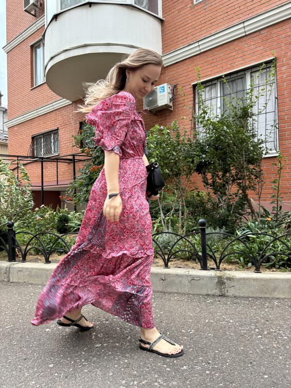 Дуже красива сукня зі штучного шовку. Підійде на розміри S-M, хто полюбляє вільний крій, то можна взяти і на xs. На талії куліска. Чудово підійде для вагітних.