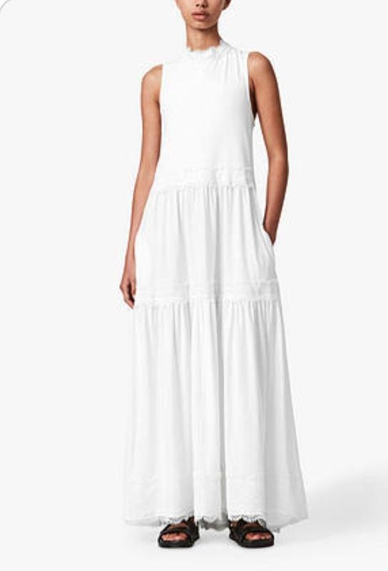 Ніжне літнє плаття Tier з мереживним оздобленням білого кольору бренда Allsaints. Модель пишного максісилуету вирізняється красивою спідницею з ярусами, обробленими чудовим мереживом, високою горловиною, без рукавів, застібкою ззаду на шиї за допомогою D-подібного металевого кільця, з двома кишенями в бокових швах. Розмір: S/M. 10-12.
