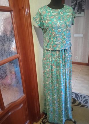 СУКНЯ длинная, очень яркая, приятная на ощупь,вискоза. На поясе толстая резинка которой корректируется длина,меет два кармана. Состояние новой,размер M-L.