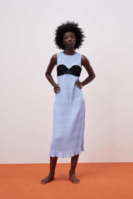 Стильное платье голубого цвета от Zara. Интересный элемент в виде вязаного бра поверх платья. Новая с биркой. Размер указанного М Длина 125см ПОГ 45см, тянется до 50см Пройма 24-25см НОТ 45см НОС 50см