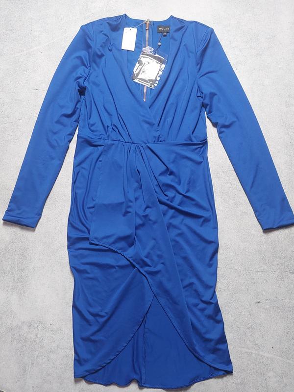 Красивое платье цвета электрик, сзади на молнии золотистого цвета. Длина ниже колен.