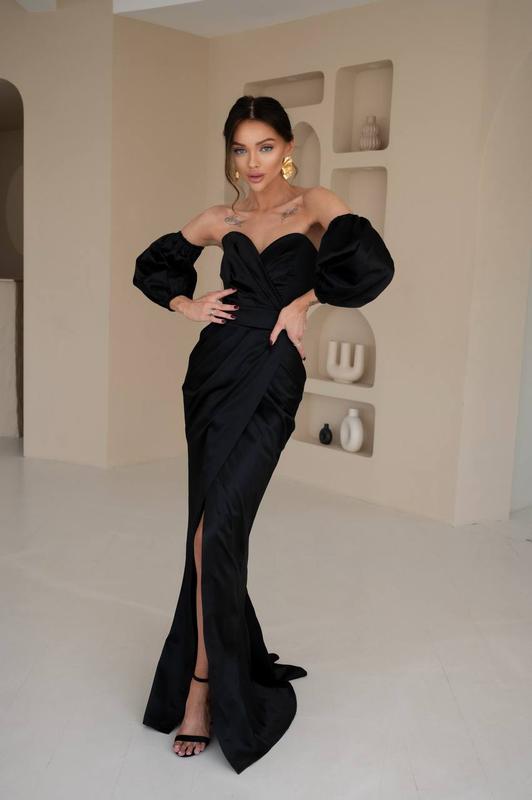 Атласное платье макси со шлейфом и разрезом от бедра, длинное платье с объемными рукавами,...