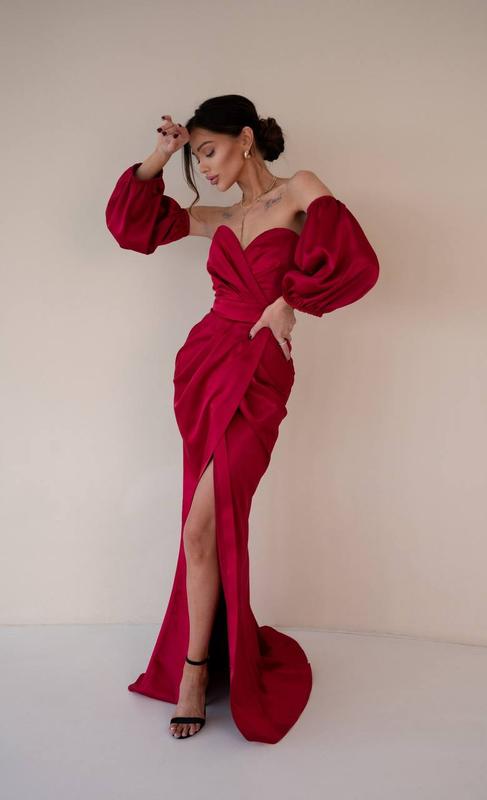 Роскошное платье со шлейфом и разрезом от бедра 🥰 В этом платье отлично все. Объемные рукава, которые можно снять. Когда в одном платье соединились роскошная ткань, корсетный верх в виде сердца, шлейф и разрез от бедра – получается настоящий шедевр. Размер: XS, S, M, L Материал: королевский атлас 11 цветов ‼️РЕАЛЬНЫЕ ФОТО