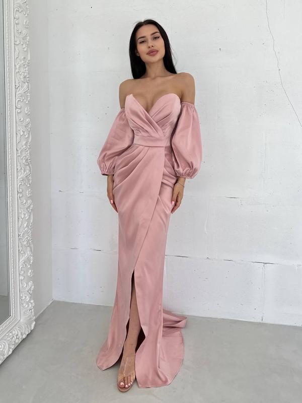 Атласное платье макси со шлейфом и разрезом от бедра, длинное платье с объемными рукавами,...