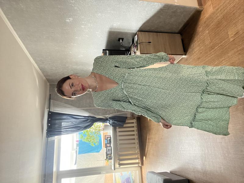 Дуже красива сукня, стильна. Приятный мятный цвет, нежный цветочный принт. Материал красиво ложится, стирается.
