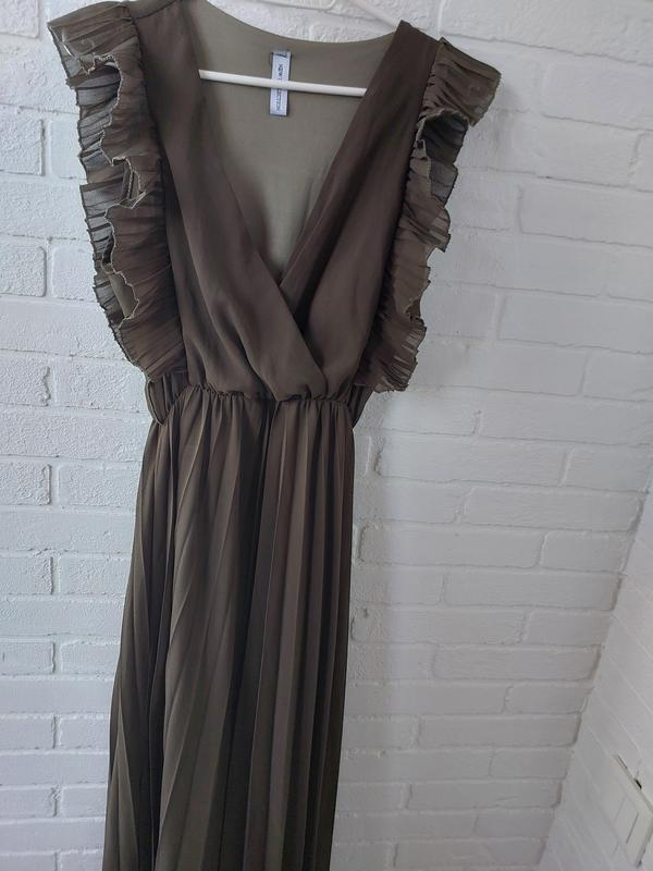 платье макси с декором на рукавах и плиссе юбкой размер М, можно небольшая Л есть одна затяжка видна на фото, также в одном месте белеватый след, в носке через плиссе не заметно, может быть отысти, я неточно плачу