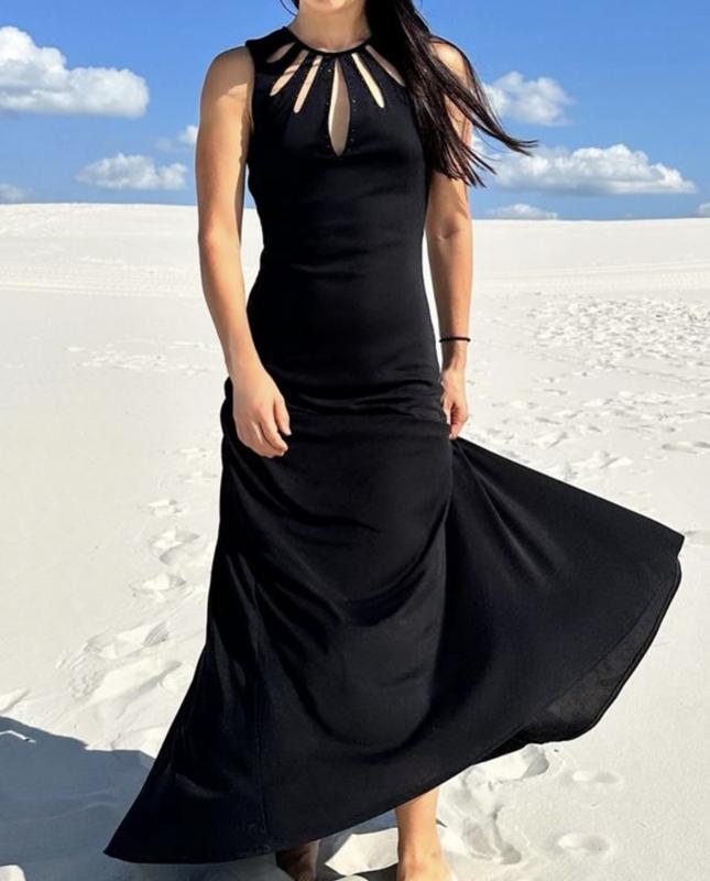 невероятно красивое вечернее длинное платье/платье в черном цвете. На подкладке. Декорирована маленькими черными камушками с вырезами в форме капель. На застежках-крючках по спинке. Размер xs/s, от плеча до низа платья примерно 152 см