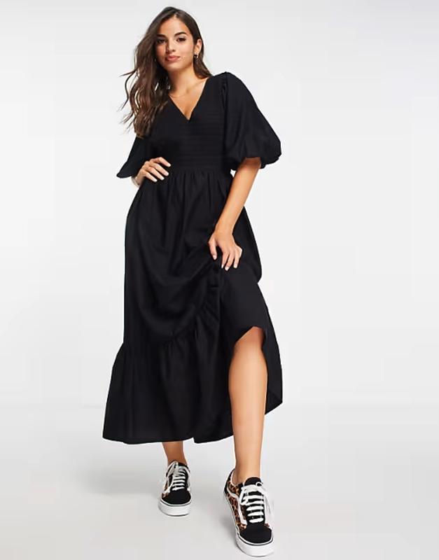 Макси платье с объемными рукавами от бренда ASOS. Натуральная поплиновая ткань, не просвечивает и не тянется. Зона лифа выполнена из ткани-резинки. Сзади в области талии платье имеет длинний пояс. V-образный вырез горловины. Размер производителя – S. Совершенно новое с биркой! Замеры: длина – 127 см полуобхват груди – 38-40 см полуобхват талии – 42 см (регулируется поясом) полуобхват бедер – свободно до 67 см длина рукава от воротника – 45 см ширина по плечам – четкой линии не имеет Состав ткани: 100% хлопок