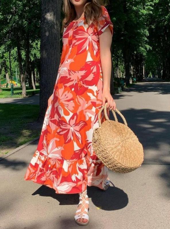 Сукня яскравого принту.Довга. Есть пояс, но можно и без него. Тканина - штапель.