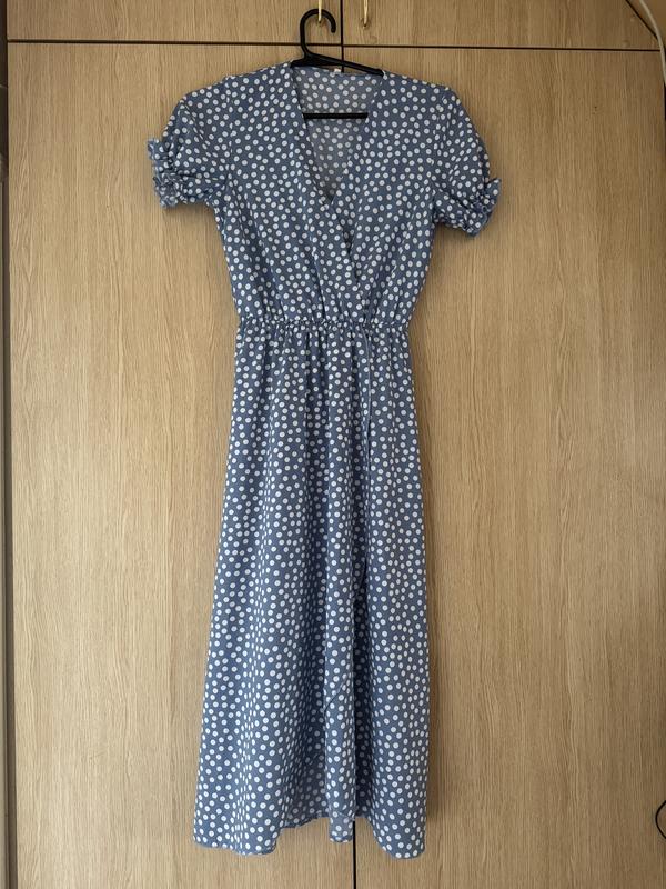 Легкое платье на запах с рукавами фонариком В носке как будто невесомая ткань приятная Длина от плеча до низа 120 см Ширина по талии 30 см (но там резинка достаточно сильно тянется) Ширина по линии груди 40 см Цвет голубой в белый горошек Недостатков нет