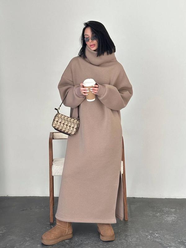 Модное теплое платье на флисе длинное с разрезами с горловиной