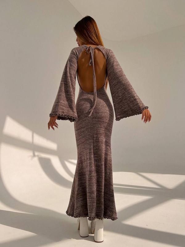 Трикотажное платье макси с расклешенными рукавами и открытой спиной ▫️тканина: утеплений трикотаж рубчик ▫️размер: S и М (L + 200 грн)