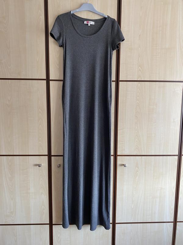 Базовое серо платье в рубчик. Длина 140 см, плечи 35, по груди 36, по талии 40, пр бедрам 43-44, по низу 60. Силуэт трапеция. По бокам скрытые карманы. Отлично тянется - -на 17-19 см