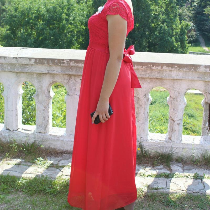 платье макси, шифоновая юбка, верх кружево, с атласным пояском.р 46-48, рост модели 168. одета один раз без дефектов.