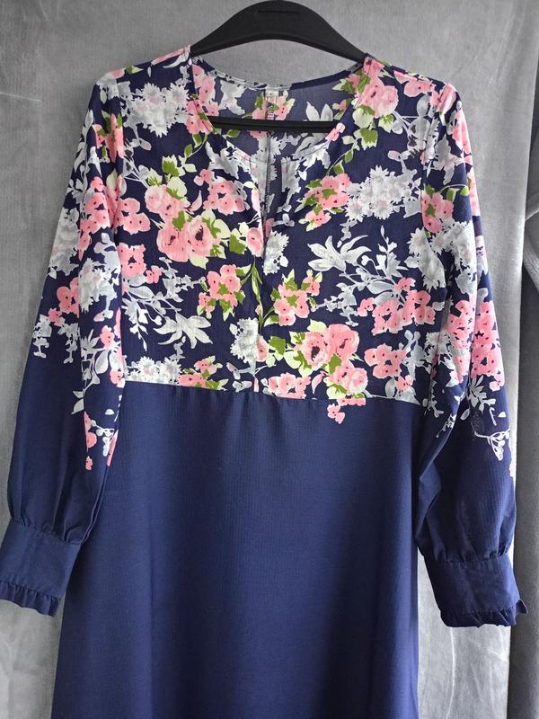 Макси платье трапеция темно-синего цвета с цветочным принтом для особых событий. Подойдет для беременных и не только. Размер L (украинский 48). Состав ткани - полиэстер. Без подкладки, но не просвечивается. Замеры: ПОГ 48 см, ПОТ 48 см, рукав 60 см, плечи 38 см, длина 141 см.