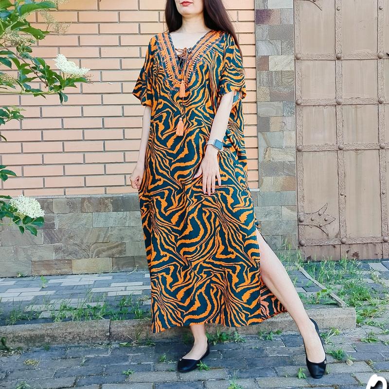 Длинное платье платье пляж для девочек оранжево-зеленая Новая Яркое платье для пляжа, хоть в городской жизни тоже уместно. Привлекает пестрый анималистический принт, шнуровка на груди и разрезы по бокам Платье прямого фасона с короткими рукавами. Платье длинное. Самая красивая - это вышивка и вырез Расцветка - оранжевый и темный изумрудный Ткань платья тонкая, не просвечивает. На бирке ткань указана: 100% вискоза Вырез на груди глубокий. Здесь шнуровка с кистями из нитей. И в качестве декора красивая вышивка. Это не аппликация, а это машинная вышивка. Сделана аккуратно и без косяков, не колется Рукава короткие, просторные - это единое целое с платьем Низ, юбка прямая. По бокам есть 2 разреза. Но за счет фасона юбки, они не сильно обнажают ножки, не глубокие Размер - единственный. Измерение на фото На параметры 85-66-93 платья свободное. Запас большой, так что можно брать и на размеры на многие большие. На 173 длина практически до пола Состояние: Новый Цена: 350 грн В Херсоне можно забрать в районе Моцарт. Отправлю Укр-почтой или Новой почтой. Наложенным платежом не отправляю. Проверяйте перед получением, обменом или возвратом нет
