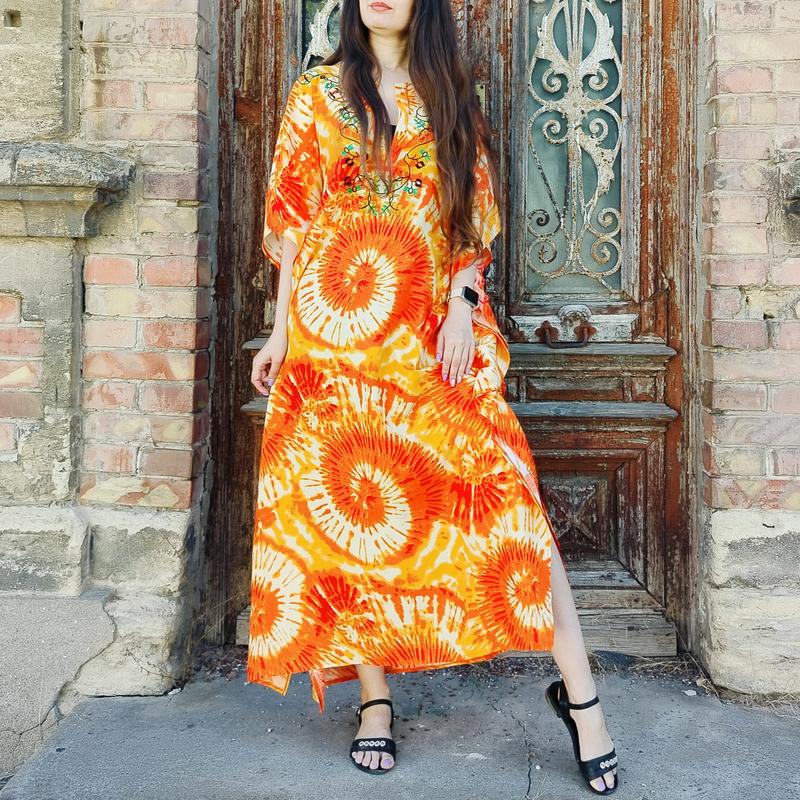 Яскрава пляжна сукня платье платья накидка помаранчева вишивка Нова Накидка для пляжа или длинное платье в пол, можно беременным скрывать животик или недостатки фигуры Состояние: новый Цена: 350 грн Модель - прямоугольник ткани пошит по бокам, получается длинная накидка с приспущенными плечами рукавов и разрезами по бокам Принт будто это техника окрашивания - tie dye, разводы ярких желто-маранчовых красок Ткань приятная на ощупь. На бирке заявлено – вискоза. Ткань плотная, не светится Спереди круглый вырез и как v образный разрез. И как декор красивая вышивка в виде растительных мотивов. Это не аппликация, а это машинная вышивка. Сделана аккуратно и без косяков, не колется По бокам разрезы, выходят чуть выше колена. Сделано просто, отступили пару см от края ткани и прошили Размер единственный, подойдет и на пышных женщин. На фото есть измерения На 85-67-93 Сов очень оверсайз. На девочек с аппетитными формами будет лучше. На 173 практически до пят, так что этот вариант больше на высокий рост В Херсоне можно забрать в районе Моцарт. Отправлю Укр-почтой или Новой почтой. Наложенным платежом не отправляю. Проверяйте перед получением, обменом или возвратом нет
