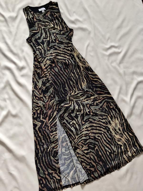 Длинное стильное платье из полуразорной ткани ( светит по контуру) на короткой подкладке, в идеальном состоянии, без дефектов. Седает мягко и невесомо, комфортный крой. Длина 123 см, Ног. 38 см и тянется, Нот. 30 см, Нос. 49 см, Высота разреза 47 см.