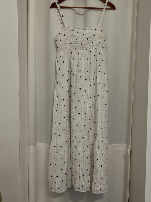 Біла сукня з синіми квіточками. Має підкладку, але немає етикеточки. Спинка оголена. Ріст моделі-160, низ тулуба-М, верх-S Якщо маєте питання-пишіть!)