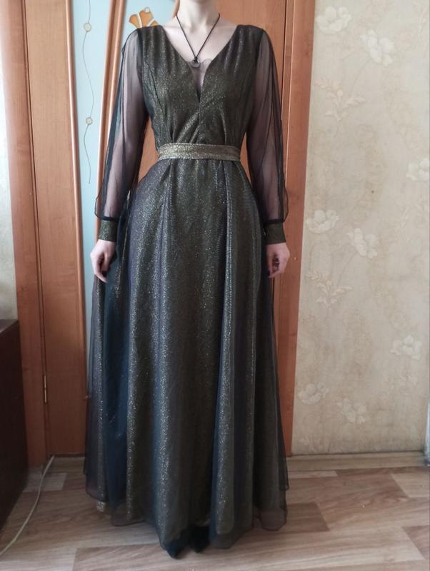 Випускна сукня кольору хакі, переливається хамелеоном, від плеча на рукаву є розріз, також на зап'ясті є кнопочки для регулювання розміру. До сукні в комплекті йде пояс такого ж кольору. Розмір сукні м але може підійти на s.