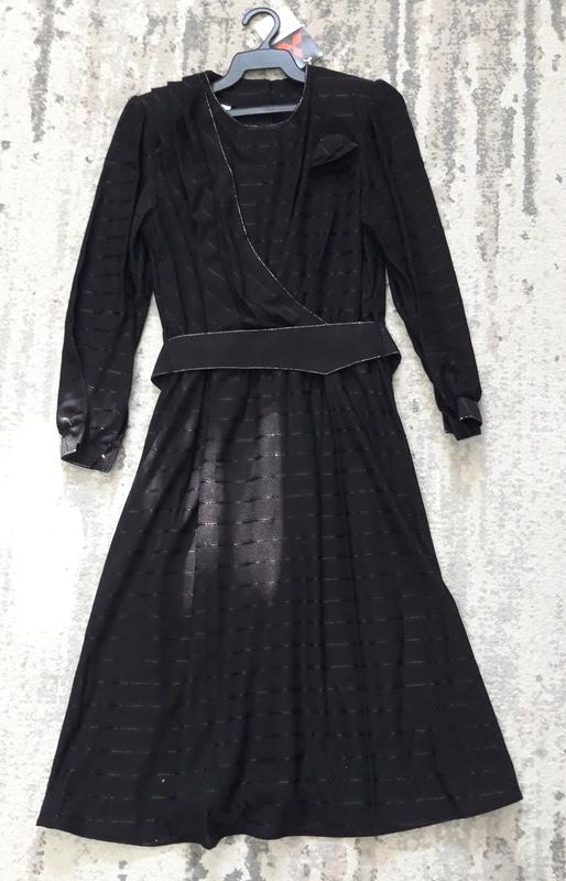 Новое платье, нарядное. Цвет черный. Размер 46. В поясе на резинке + зверза поясок. Сзади на пуговицах по всей спинке. Ширина плечей - 36 ,5 см. Длина рукава - 53 см. Полу объем груди- 47 см. Полу объем талия - от 39 см до 52 см.( резинка красиво тянется). Длина платья- 106 см. Ткань стрейчевая, еще потянется при необходимости.