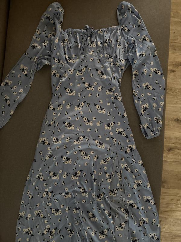 Нежно голубое платье в цветочек с вырезом