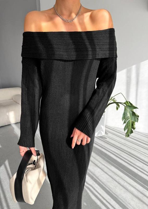 Длинное теплое платье с длинными рукавами и спущенными плечами