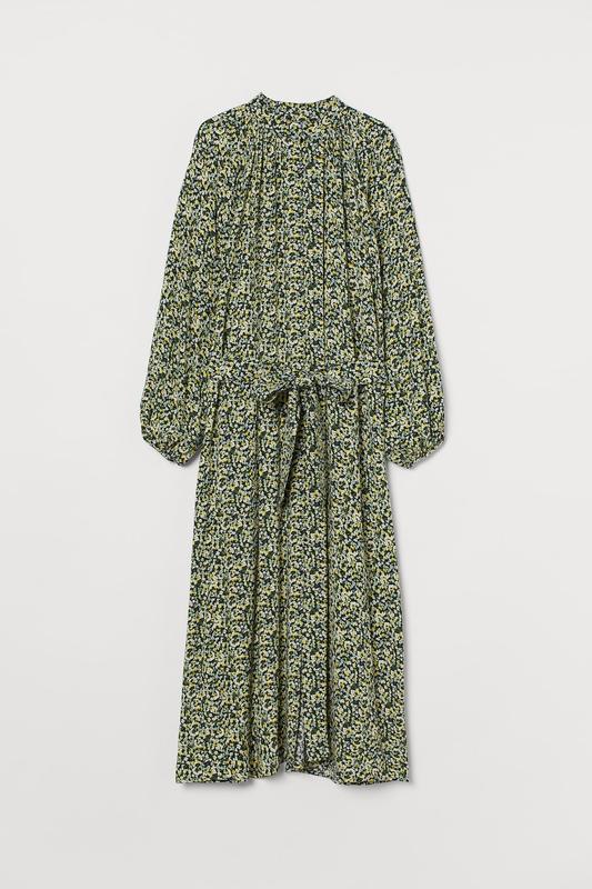 Размер L (длина 115 см, пог 60 см, поб 68 см.) Платье длиной до икр из вискозы с небольшим собранным воротником-стойкой, прикрытыми пуговицами спереди, длинными рукавами реглан и узкими манжетами с прикрытыми пуговицами. Съемный пояс на талии и мягкая драпировка, мягко расклешенная юбка. Без подкладки.