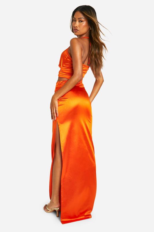 Платье в пол, макси, оранжевое, с кольцом, с разрезом, на одно плечо