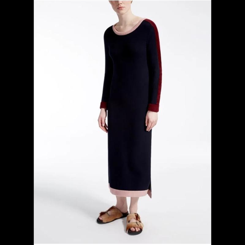 Вязаное длинное синее платье Weekend дорогого бренда Max Mara прямого покроя из вискозного трикотажа с контрастной отделкой из шенилла на горловине, рукавах и подоле изделия. Модель с круглым вырезом, длинными рукавами, боковыми разрезами по подолу с деталями из люрекса. Оригинал. Размер: М. ПОГ - 46 см. ПОТ ПОБ - Рукав с плечом - 76 см. Длина - 127 см. Материалы: Трикотажное полотно - 72% вискоза, 28% полиэстер. Детали - 62% вискоза, 38% нейлон.