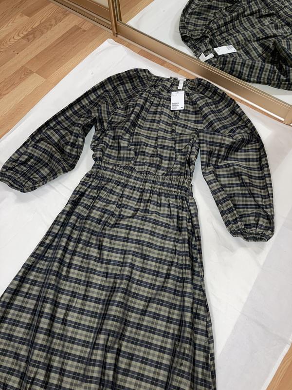 Платье H&M размер XS. Очень стильная. Красивые рукавчики. Сзади выглядит так, словно блуза и юбочка по отдельности, там разрез небольшой и он в районе талии. Замеры: длина 125 см, в груди 48 см, в поясе резинка 33 см, тянется красиво. Хороший состав ткани - вискоза, катон, полиамид.