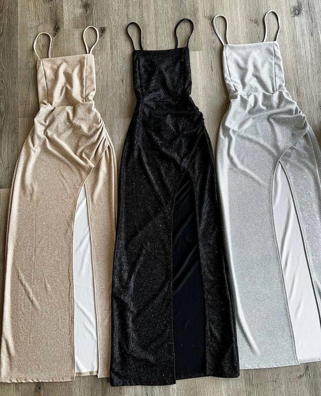🥀Новинка🥀 Сукня Код 201 rb Тканина: люрекс Цвета: черный, серебро, золото, синий Размеры: 42-44, 46-48 Изысканное блестящее платье с переплетением на спинке и разрезом на ножке. Спинка открытая и регулируется завязками. Ткань красиво играет на свету✨