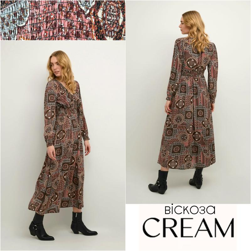 Платье из вискозы от бренда Cream – это настоящий шедевр для ценителей стиля и комфорта. Ее легкая и приятная на ощупь ткань дарит ощущение нежности, а изысканный принт в восточном стиле переносит в мир тепла и уюта. Детали дизайна: Принт: многогранные орнаменты в спокойных розовых, бордовых и серых тонах, создающих гармоничный этнический рисунок. Фасон: свободный крой, подчеркивающий легкость образа, дополненный эластичной вставкой на талии для акцента по фигуре. Рукава: длинные, с нежными сборками у манжетов, придающими образу утонченности. Длина: миди, которая дарит универсальность и подходит как для будничного образа, так и для особых моментов. Это платье идеально сочетается с сапогами или ботинками, создавая стильный лук. Благодаря материалу из вискозы, она отлично "дышит" и комфортна в носке даже в течение целого дня. Она станет незаменимым выбором для тех, кто любит выглядеть роскошно, не жертвуя удобством. размер от производителя 40 длина 140 см грудь 55 см талия на резинке 37 см + тянется в бедрах свободно плечи 42 см рукав 69 см с манжетом на резинке в составе: 50% вискоза Lenzing Evero 50% вискоза