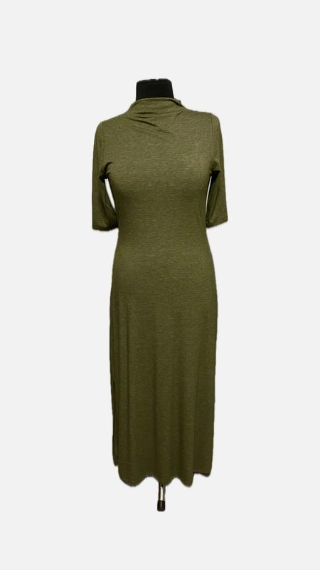 Очень красиво смотрится на фигуре. Длинное трикотажное платье интересного темно зеленого цвета. Красивая, драпирующаяся по желанию горловина рукав 2/3, разрезы по бокам, эффектный широкий поясок, который отлично подчеркивает талию и прячет «зайве», можно завязывать как спереди, так и сзади. Замеры: полуобхват груди 48 см; Полуобхват талии 43 см; Полуобхват бедер 55+ см; Длина платья 142 см; Длина рукава 36 см