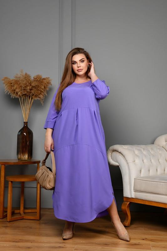 Сукня Код 3621 Тканина: софт. Цвета: сиреневый, марсала, мокко,черный, темно-зеленый, ярко-синий. Размеры: 52-54, 56-58, 60-62, 64-66. Длина платья: 137, 137, 138, 138 см. Длина рукава от горловины: 59, 60, 61, 62 см. Обхват рукава: 42, 44, 46, 48 см. Замеры готового изделия: 52-54 ОГ 116 ОТ 120 ОС 140 56-58 ОГ 124 ОТ 128 ОС 148 60-62 ОГ 132 ОТ 136 ОС 156 64-66 ОГ 140 ОТ 144 ОС 164 Невероятно стильное повседневное платье из софта ( ткань растяжимости не имеет). Силуэт свободный, к низу ширится. Талия отрезная с небольшими защипами. Линия плеча спущена, рукав на манжете. Вырез горловины круглый. Низ платья оформлен асимметрично. В боковых швах обработаны карманы. Это платье идеально скрывает все недостатки фигуры и делает его визуально стройнее.