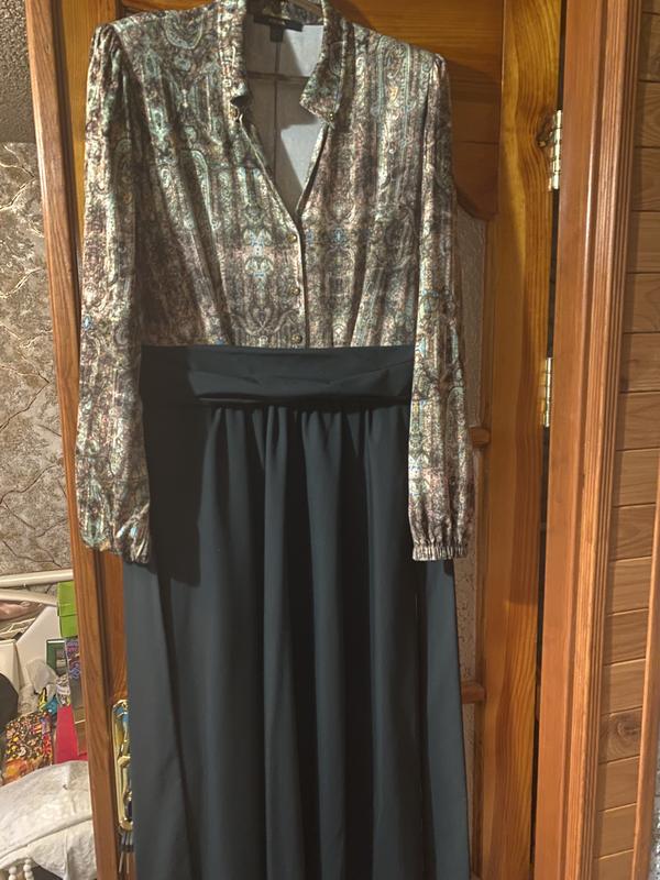 Красивое платье, длинное, может быть как празднично, сочетание тонкого трикотажа и костюмной ткани. В груди55, талия 45, длина 155, рукав 69. В стегнах 69. Тканина тягнеться