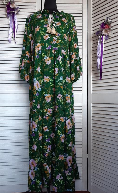 Длинное, зелёное платье в цветочный принт в бохо, этно стиле corte hindu