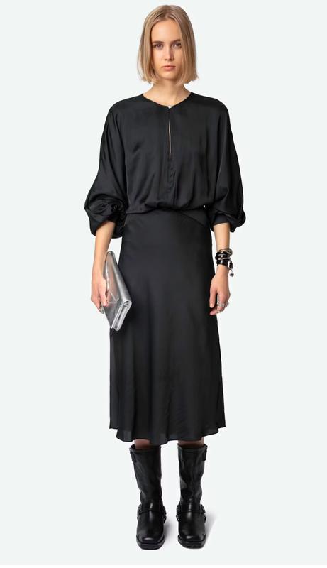 Женское черное атласное длинное платье - Круглый вырез украшен драгоценной пуговицей со стразами и глубоким вырезом - Застежка-молния сзади - Свободные длинные рукава и манжеты на пуговицах - Драпировка на талии - Расклешенная юбка