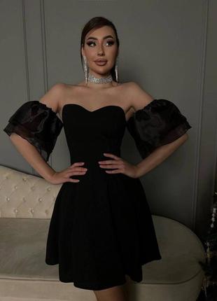 Цвет: черный Материал: креп-дайвиг + органза Сбоку потайная молния, рукава на резинке пришиты к платью