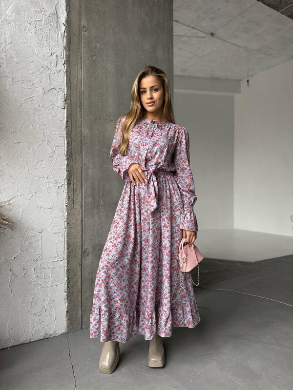 Длинное платье в цветочный принт с длинными рукавами и поясом