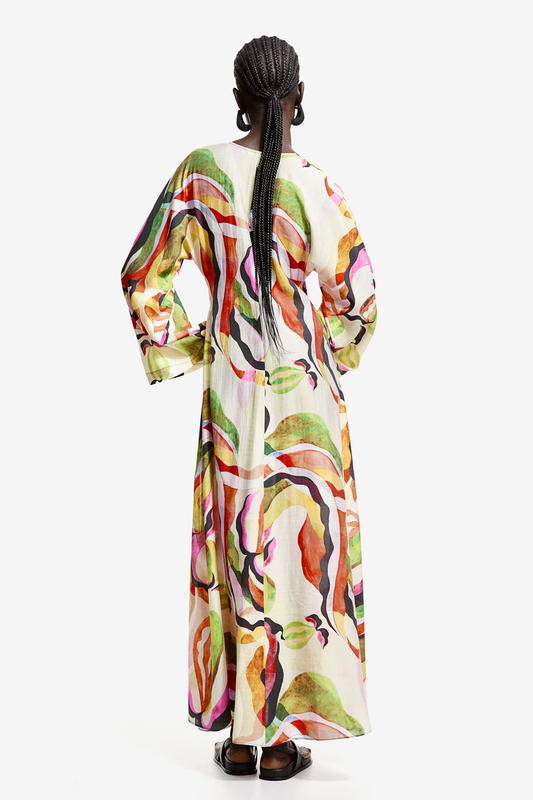 Платье-туника на шнуровке h&m оригинал Длинное платье-туника из мягкой ткани с нежным блеском. Трапециевидный крой, длинные широкие рукава. Глубокий V-образный вырез с изящными петлями, через которые на концах продеты узкие ленты, украшенные бисером. Диагональный шов на талии и длинные разрезы спереди и по бокам. Без подкладки. Вискоза 89%, Полиэстер 11% № продукта:1237873001 Длина:Длинный Длина Рукава:Длинный рукав Мода:Нормальный стиль Стиль:Трапециевидный крой, вырез с вырезом, разрез. Вырез:V-образный вырез Описание:Кремовый/розовый/красный/зеленый/черный/желтый/фиолетовый, с рисунком