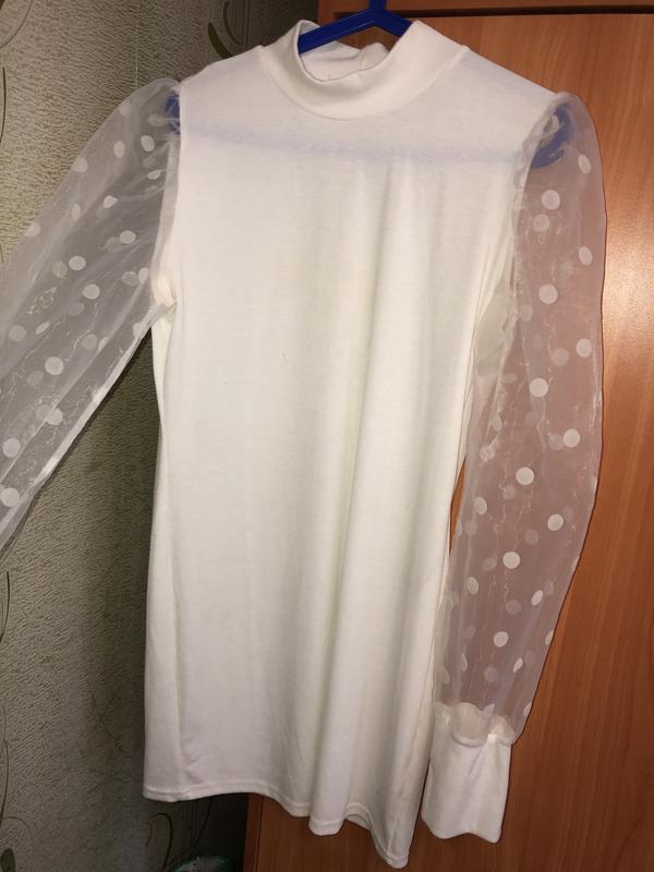 Платье белого цвета с прозрачными рукавами на манжетах