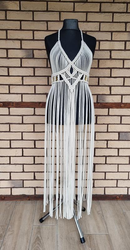 платье, выполненное в технике макраме. Отличный вариант для атмосферных фотосессий. В таком платье вы почувствуете себя женственным и невероятно привлекательным. Натуральные нити создают узелки, которые привлекают внимание окружающих на нужные зоны, да разглаживают другие части тела Идеально для путешествий и пляжного отдыха. Хлопковые нити не дадут Вам почувствовать жару, а платье сделает ваш отдых незабываемым. Цвет - айвори, размер xs-s, платье декорировано латунными трубочками.