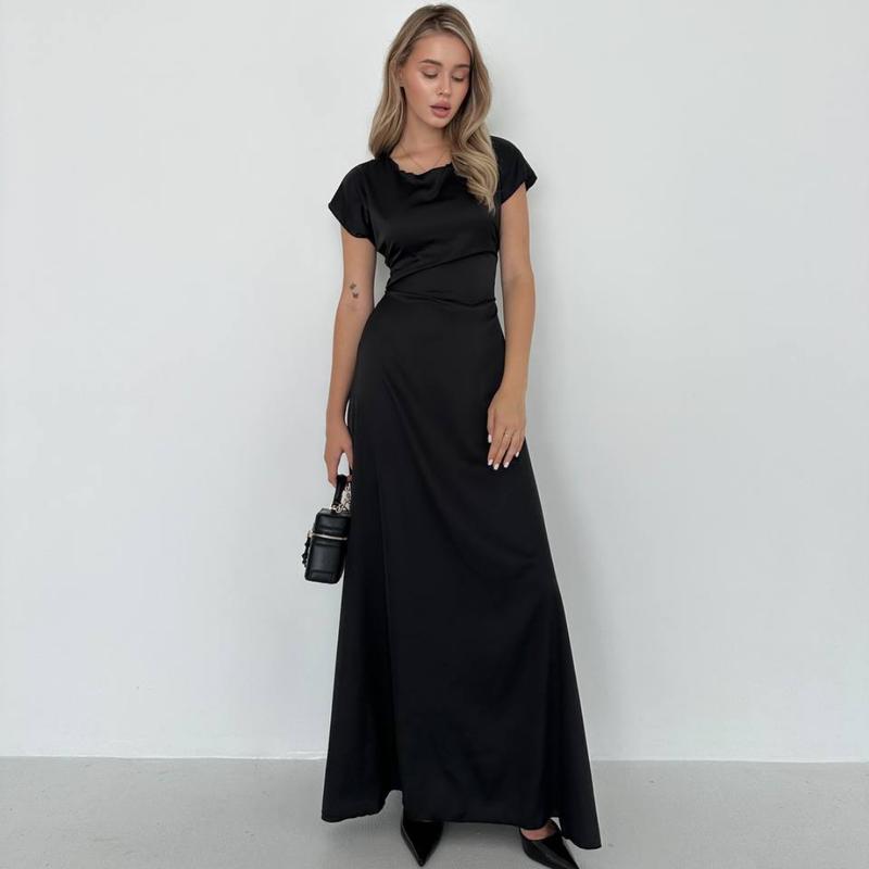 Трендовое женственное шелковое длинное платье с завязками на талии и коротким рукавом
